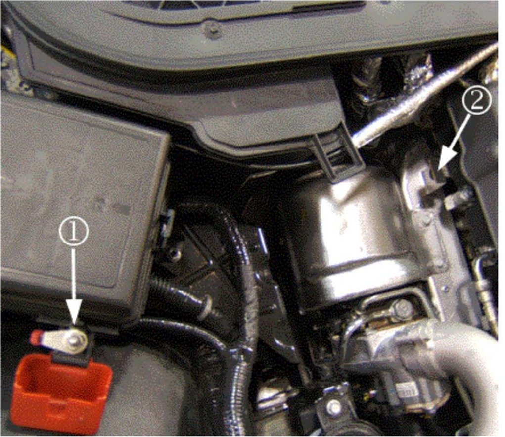 Instruct the customer on the correct procedure to jump start the vehicle. Refer to "Jump Starting" in the appropriate model and model year Owner Manual. The illustration above shows the correct locations of the remote positive terminal (1) and remote negative ground bracket (2). The remote negative ground bracket is marked GND (-).