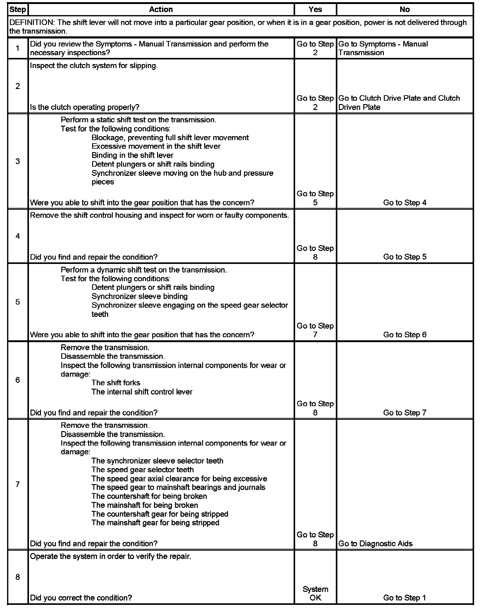3. A static shift test is performed by shifting into all gears with the engine not operating. While performing the test, you should note how the shift lever movement feels. Also, feel for the shift rails moving freely, the detent plungers operating when coming out of a gear and going in the next gear, and the synchronizer sleeve movement.