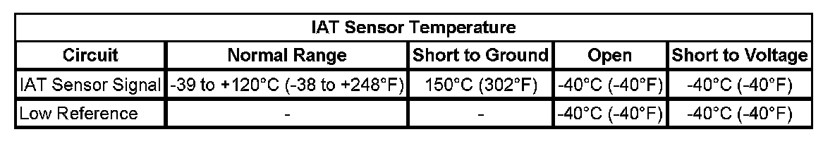 Measure and record the resistance of the IAT sensor at various ambient temperatures, then compare those measurements to the Temperature vs Resistance table.