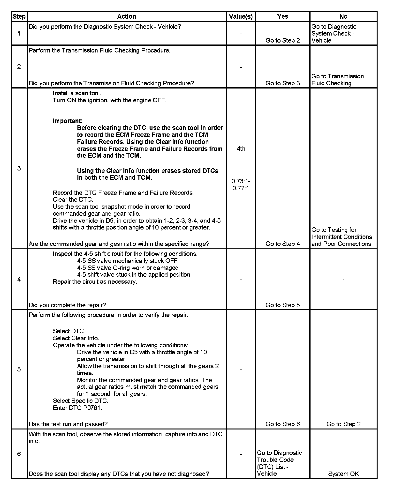 The transmission control module (TCM) monitors the actual gear ratio, and compares the actual gear ratio with the commanded gear ratio. DTC P0761 sets under two conditions: