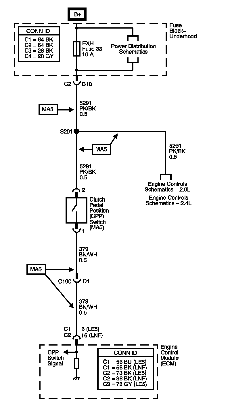 The clutch switch is a normally closed switch, clutch pedal released. The engine control module (ECM) detects an ignition voltage on the clutch switch circuit when the clutch switch is closed. The ECM detects 0 volts on the clutch switch circuit when the clutch switch is open, clutch pedal depressed.