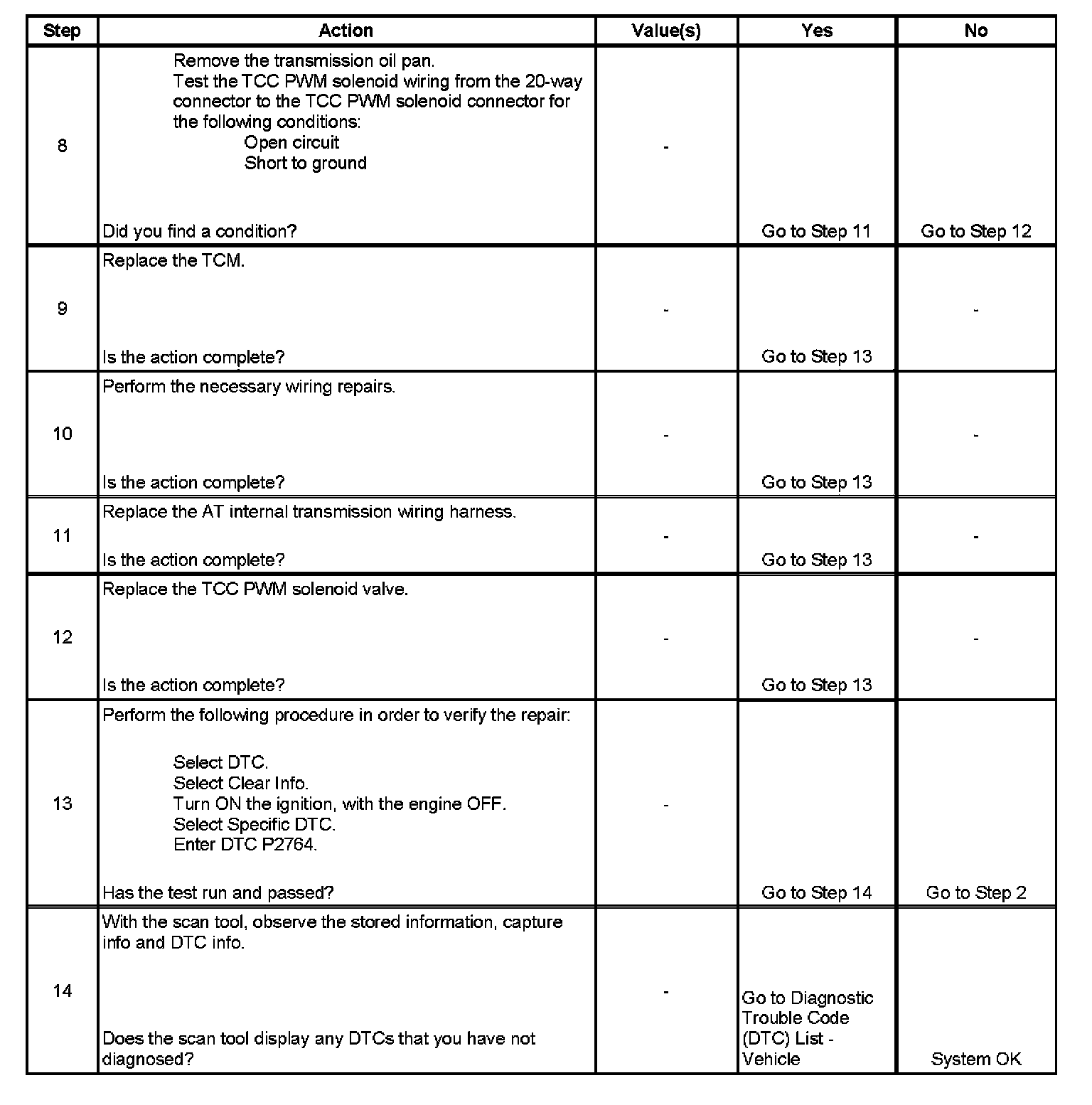 When the TCM detects a continuous open or short to ground in the TCC PWM Solenoid valve circuit, then DTC P2764 sets. DTC P2764 is a type B DTC.