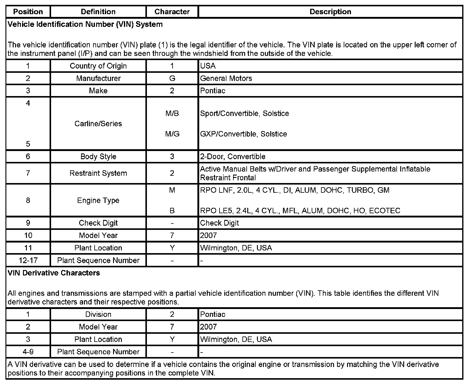 Vehicle, Engine and Transmission ID and VIN Location, Derivative and Usage