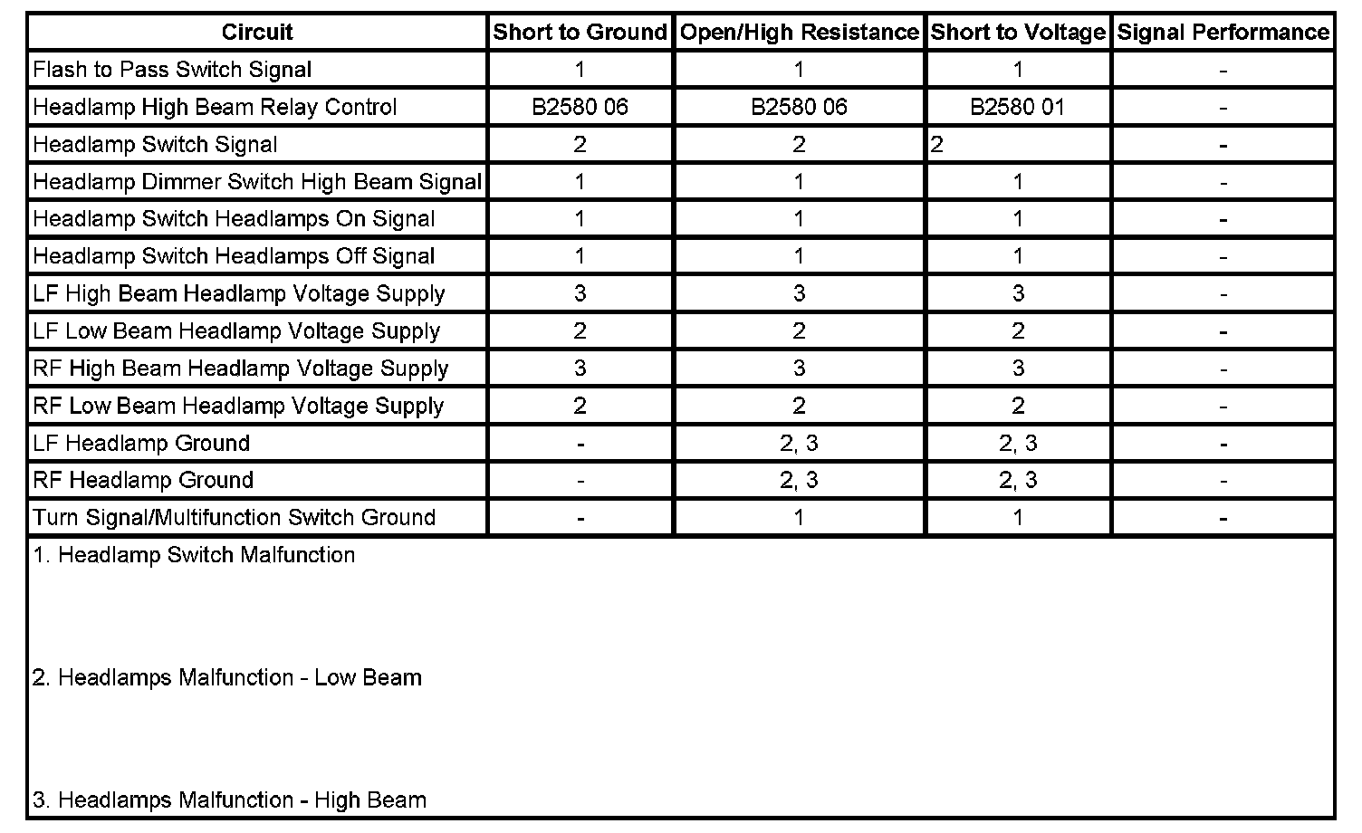 • If the high beam headlamps do not activate, test the control circuit for an open/high resistance. If the circuit tests normal, test or replace the inoperative high beam headlamp.