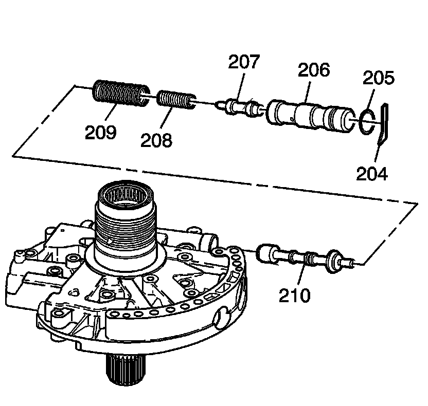 5. Remove the line boost valve spring (208) and the pressure regulator valve spring (209).