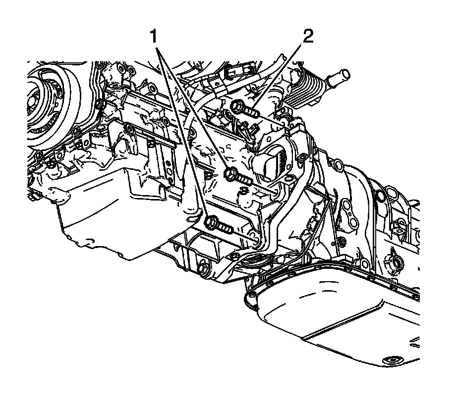 6. Remove the right side transmission to engine mounting bolts (1, 2).
