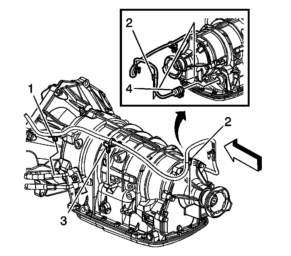 15. Disconnect the wiring harness clips (1-3) from the transmission, and position the wiring harness aside.