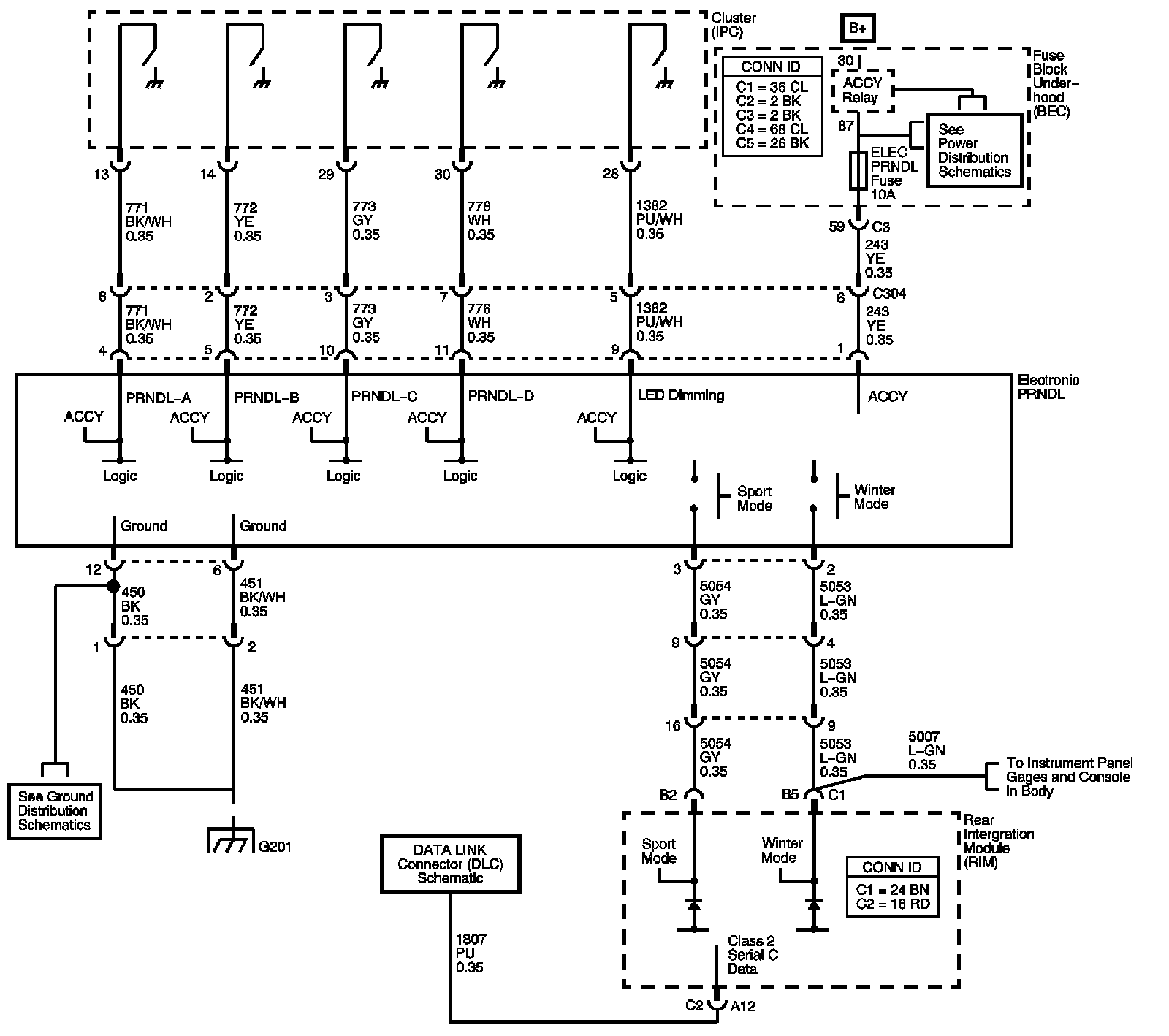 The winter mode allows the driver selection of a third gear start in order to reduce wheel spin under low traction conditions. Winter mode programming in the transmission control module (TCM) will command the 1-2 shift solenoid On and the 2-3 and 4-5 solenoids Off, enabling third gear for greater traction. The winter mode switch is a console mounted momentary contact switch located on the electronic PRNDL assembly. Accessory voltage is supplied to the electronic PRNDL assembly through the ELEC PRNDL fuse. When the winter mode switch is depressed, it momentarily contacts the switch signal circuit. The rear integration module (RIM) recognizes the voltage on the circuit and sends a class 2 serial data message to the dash integration module (DIM). The DIM sends a class 2 message to the engine control module (ECM). The ECM sends a request to the transmission control module (TCM) through the controller area network (CAN) to enable the winter mode program.