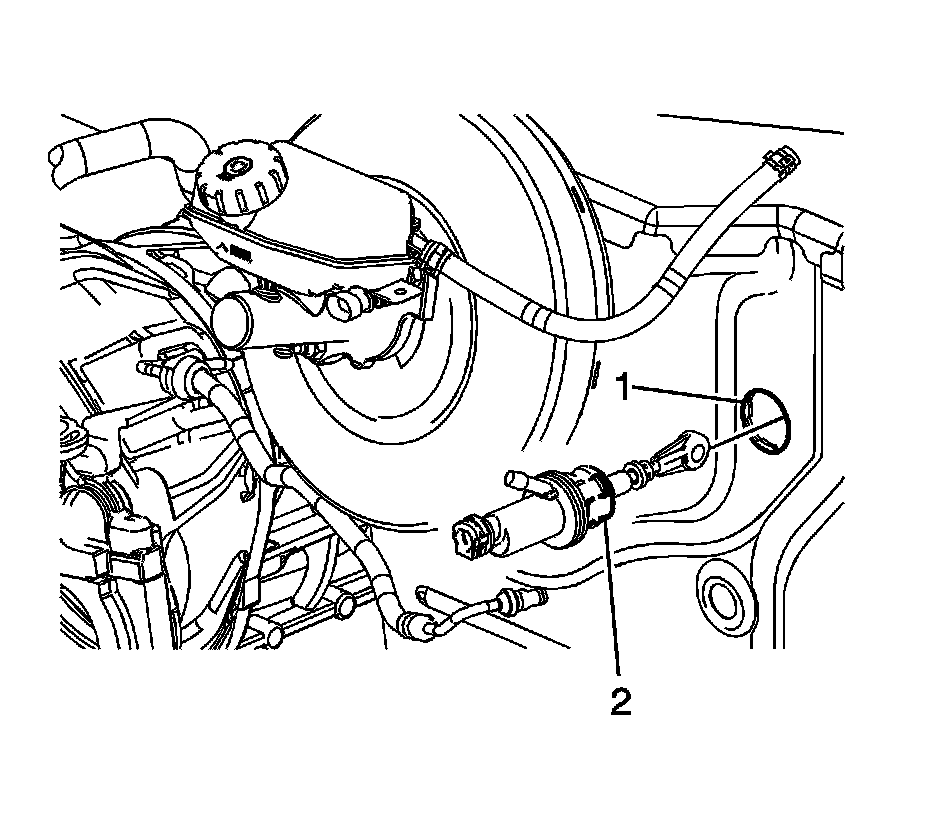 3. Install the clutch hose/pipe assembly retainer clip (2) to the clutch master cylinder.