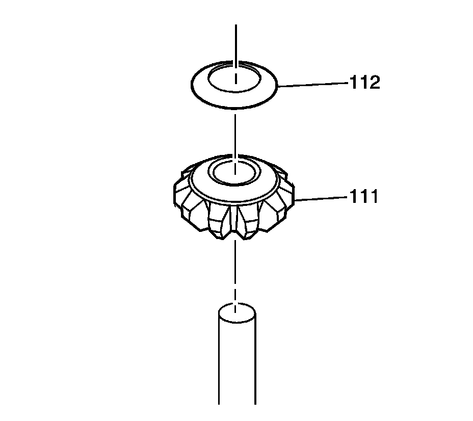 7. Remove the beveled washer from the axle side gear. Note that the orientation of the beveled washer (108) faces out.