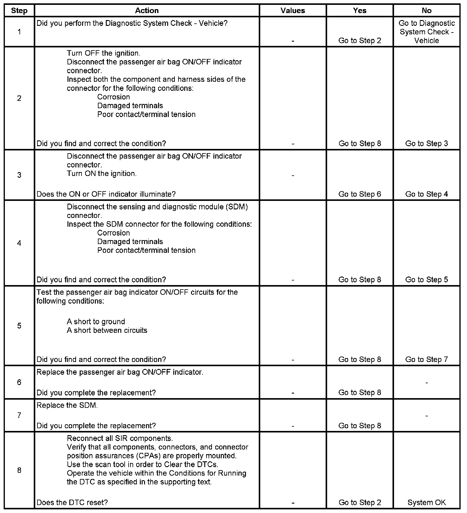 The passenger air bag ON/OFF indicator circuit consists of the inflatable restraint sensing and diagnostic module (SDM) and the passenger air bag ON/OFF indicator. If the SDM detects a malfunction within the circuit, a DTC will be set.