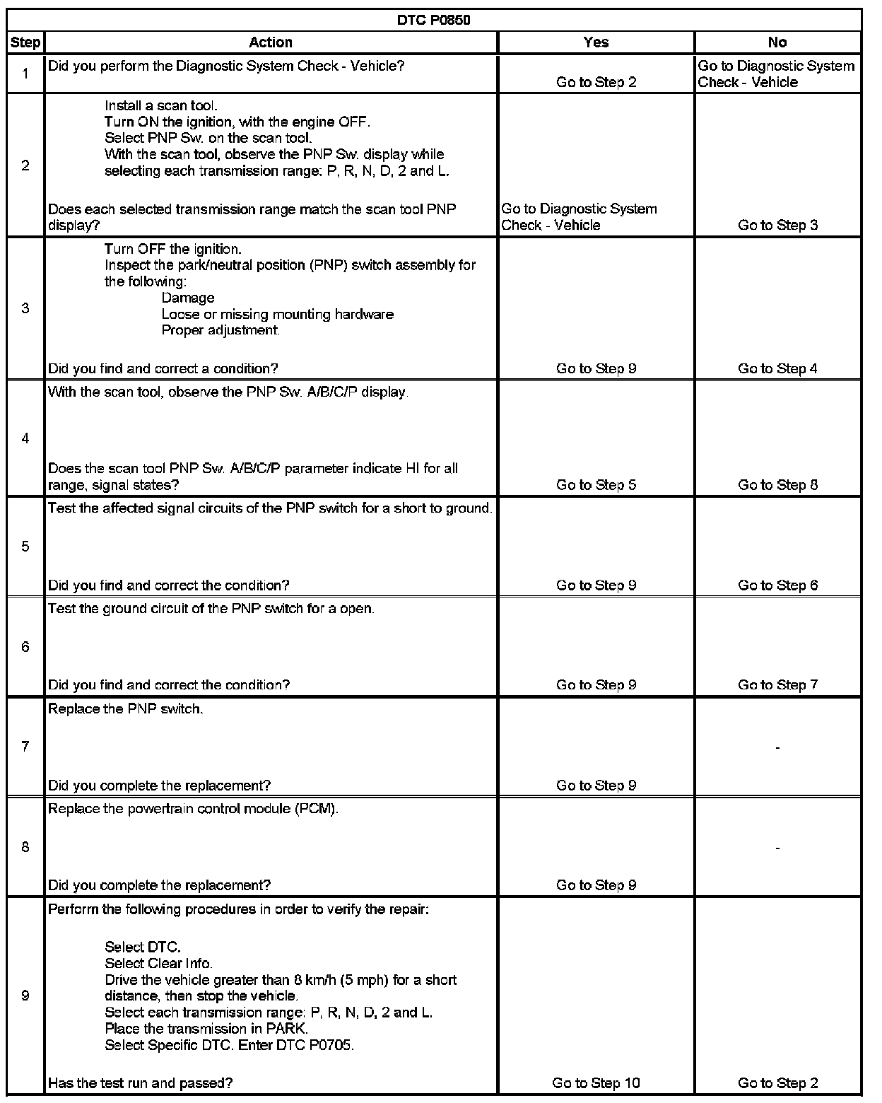 DTC P0850 will set if the PCM detects start-up in a drive range or vehicle speed in the PARK or NEUTRAL range. DTC P0850 is a type C DTC.