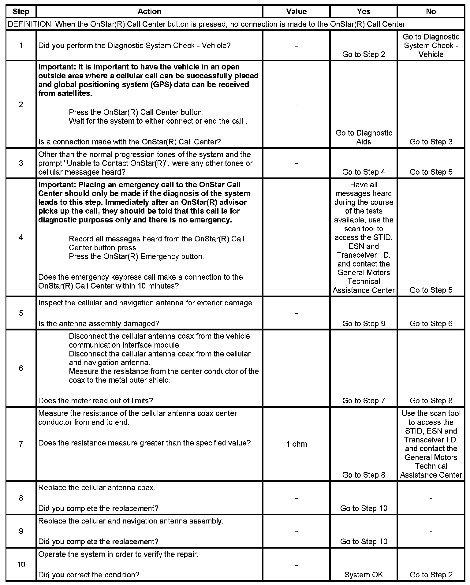 * If an OnStar(R) Emergency call is able to successfully connect the vehicle to the OnStar(R) Call Center when an OnStar(R) Call Center button press is not, there may be a failure in the ability of the OnStar(R) system in the vehicle to be recognized by the local cellular carrier.