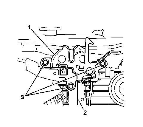 2. Install the hood latch (1) to the vehicle. Secure the latch with the 3 bolts (3) and one plastic retainer but do not tighten fully.