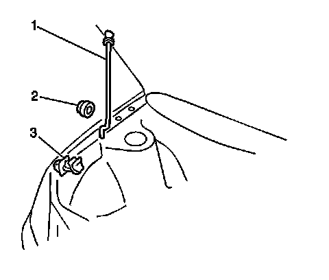 2. Remove the hood hold-open rod (1) from the retaining clip (3).