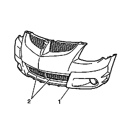 Using a small flat-bladed tool, reach into the opening on the front lower fascia (1) and depress the retaining tabs that lock the lower fascia grille (2).