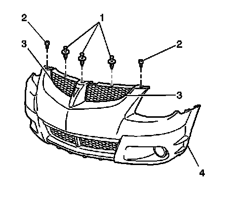 3. Using a small flat-bladed tool, reach into the opening behind the front fascia and depress the retaining tabs that lock the front fascia grille (3) to the front fascia (4).