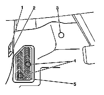 Install the foot rest (5) to the floor panel studs. Secure the foot rest, by fastening the 2 plastic retainers (4).