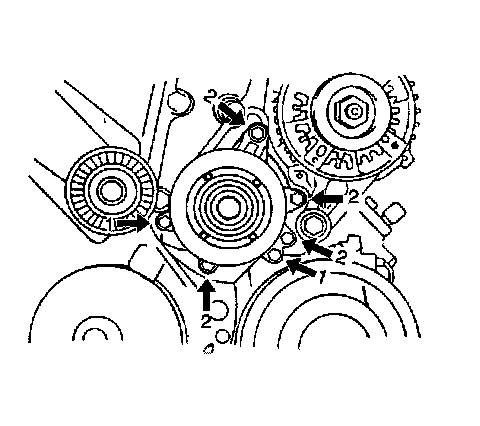 ^ Tighten the water pump bolts (2) to 11 N.m (8 lb ft).