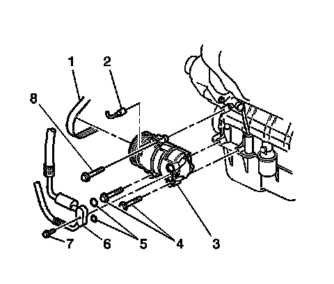 5. Remove the 1 bolt (7) and the compressor and condenser hose assembly (6) from the compressor.