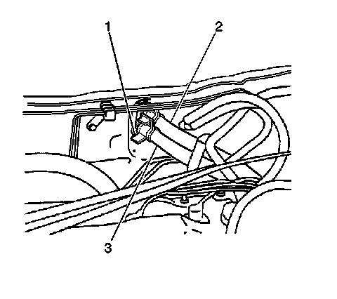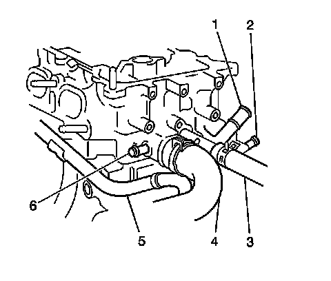 3. Remove the clamps and the inlet and outlet hoses (1, 3) from the engine cylinder head.