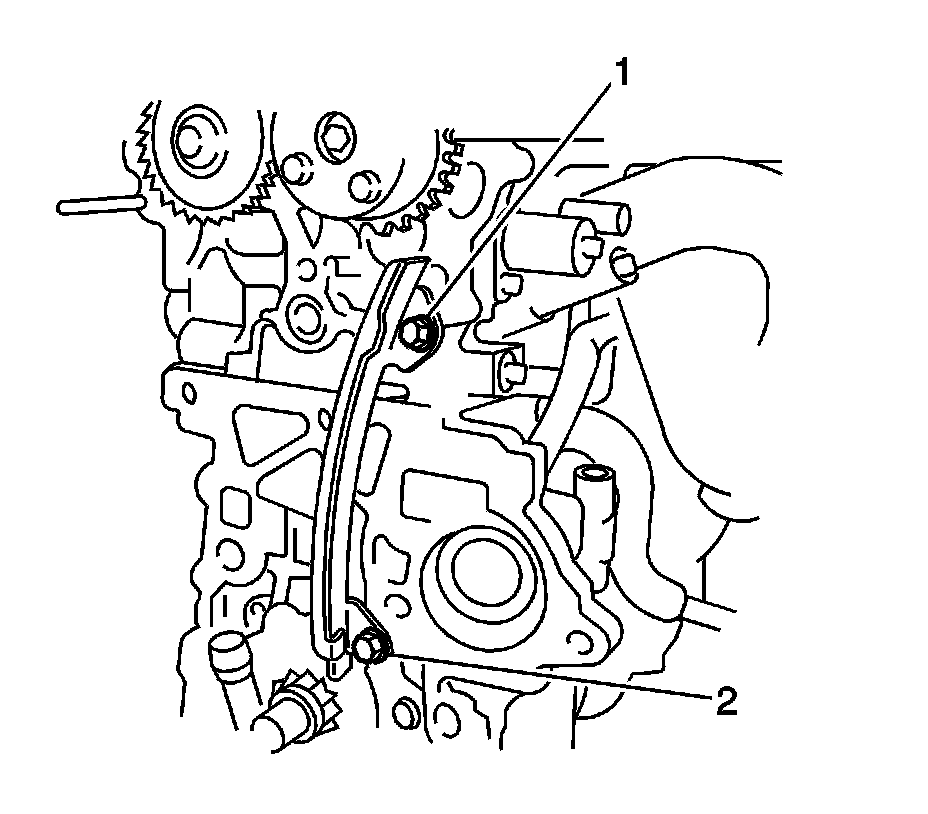 ^ Install the timing chain shoe. Secure the timing chain shoe using two bolts (1, 2).