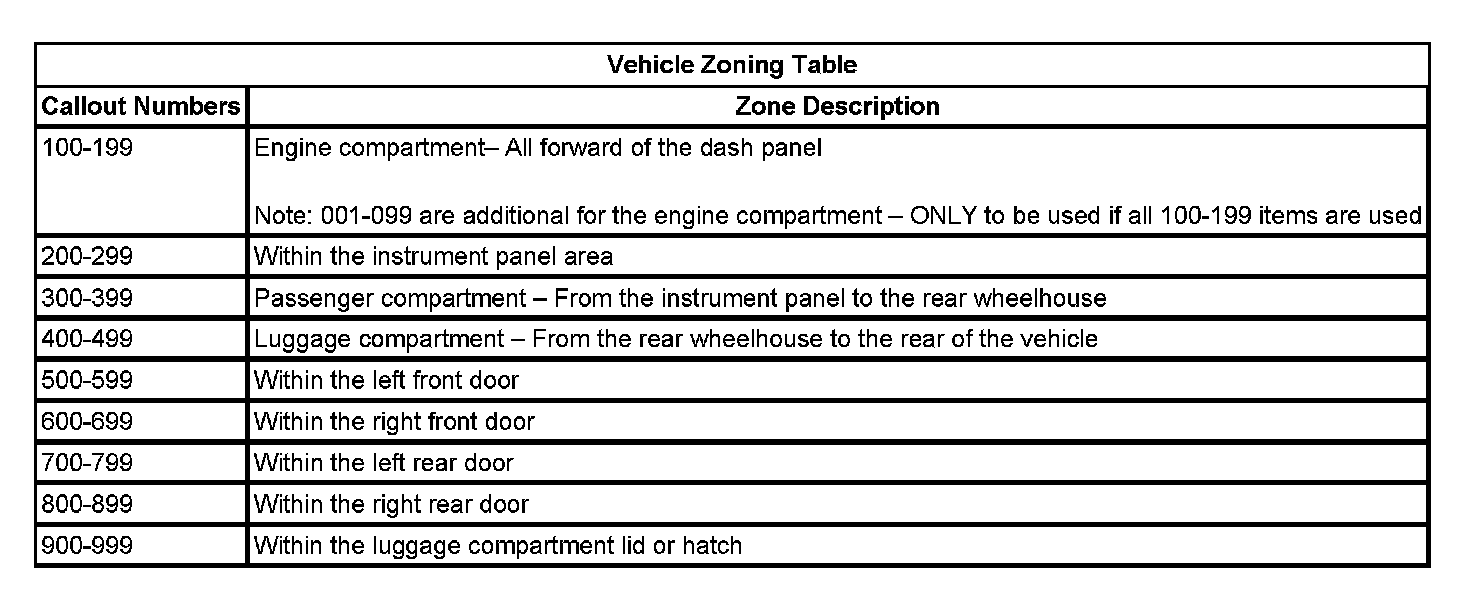 All grounds, in-line connectors, pass-through grommets, and splices have identifying numbers that correspond to where they are located in the vehicle. The table explains the numbering system.
