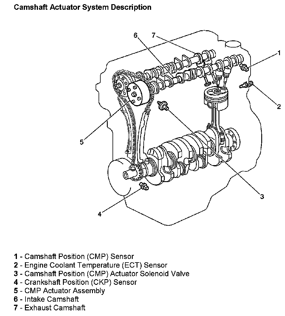 The CMP actuator solenoid valve (3) is controlled by the PCM. The crankshaft position (CKP) sensor (4) and the CMP sensor (1) are used to monitor changes in camshaft position. The PCM uses information from the following sensors in order to calculate the desired camshaft position: