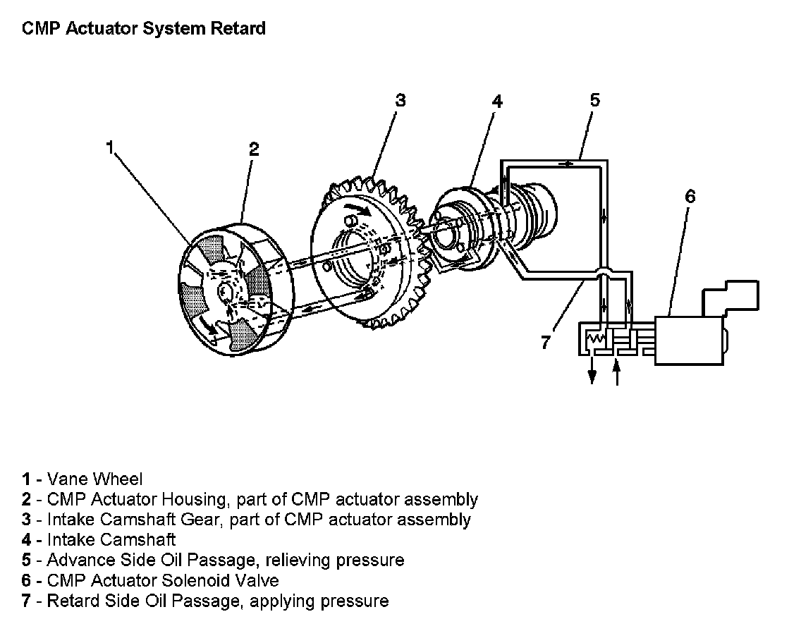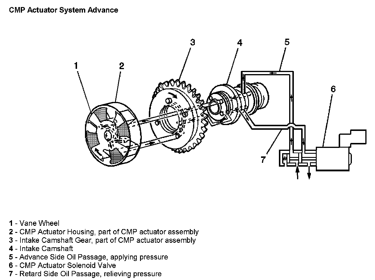 Oil flowing to the CMP actuator housing (2) from the CMP solenoid advance passage (5) applies pressure to the advance side of the vane wheel (1) in the CMP actuator assembly. At the same time the CMP solenoid retard passage (7) is open, allowing oil pressure to decrease on the retard side of the vane wheel. These two simultaneous actions cause the vane wheel (1) to rotate clockwise, advancing camshaft advance timing.