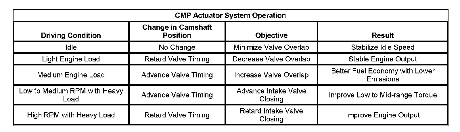 The table provides camshaft phase commands for common driving conditions.