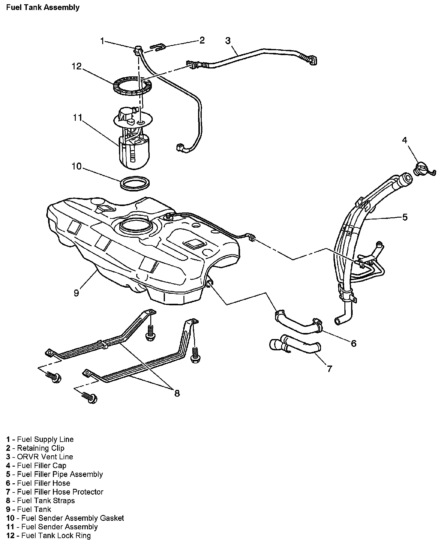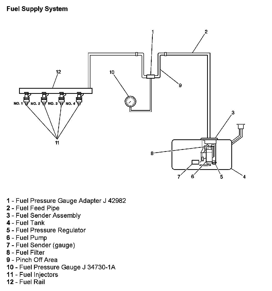 The supply of fuel is stored in the fuel tank. An electric fuel pump pressurizes the fuel through to the fuel filter and out to the fuel lines and the fuel rail. The electric fuel pump is suspended from the top of the fuel tank as part of the fuel sender assembly. The fuel pump is designed to provide fuel at a pressure above the regulated pressure needed by the fuel injectors. The fuel pressure regulator keeps the fuel supplied to the fuel injectors at the regulated pressure.