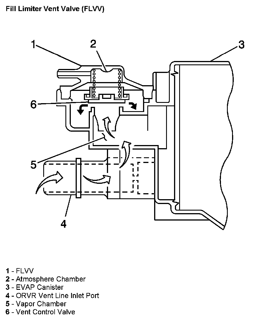 The fill limiter vent valve (FLVV) (1) is an integral part of the EVAP canister (3). The cross sectional view shows the path of fuel vapors passing through the valve directly into the EVAP canister. When the fuel filler cap is removed during refueling, the atmosphere chamber (2) fills with atmospheric pressure that has entered through the port from the fuel filler pipe. The pressure in the atmosphere chamber (2) opens the passage to the vapor chamber (5) by opening the vent control valve (6). Refueling causes the internal pressure in the fuel tank to increase, pushing fuel vapors into the ORVR port (4) and up through the vent control valve (6) into the EVAP canister (3). When the fuel tank is full, the tank vapor control valve (5) closes, sealing off the passage into the EVAP canister.