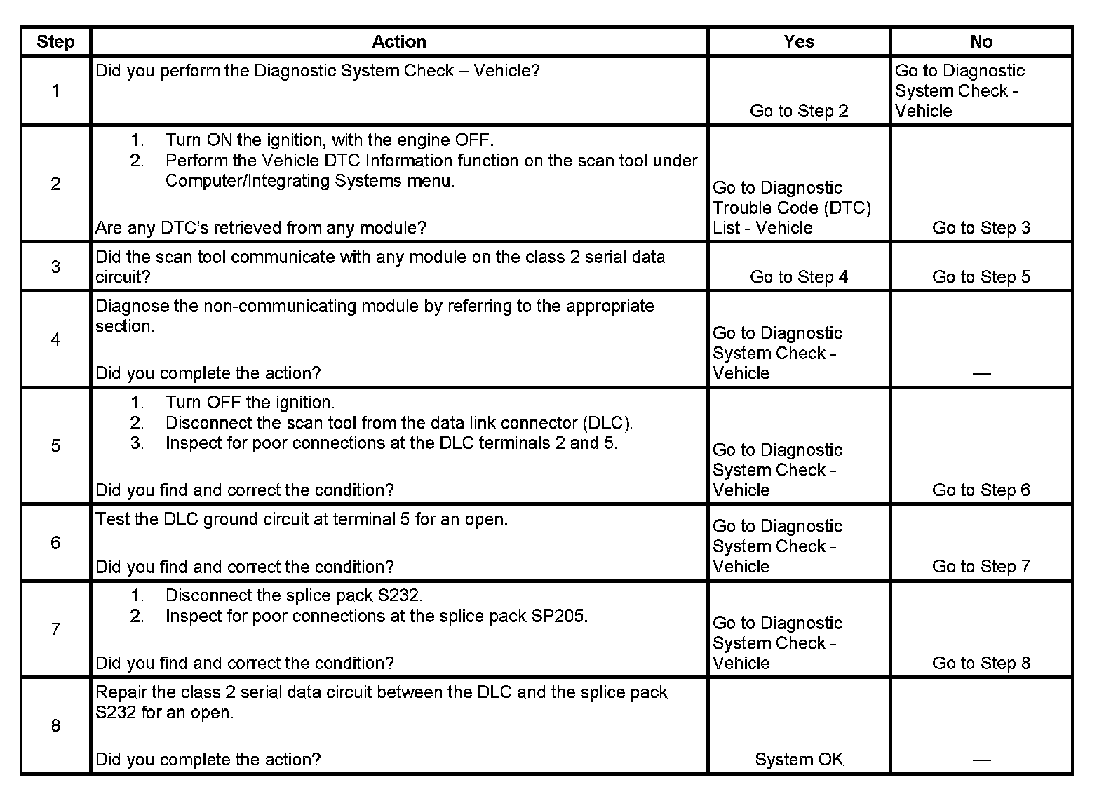 8. An open in the class 2 serial data circuit between the DLC and splice pack S232 will prevent the scan tool from communicating with any module on the class 2 network. This condition will not set a DTC.
