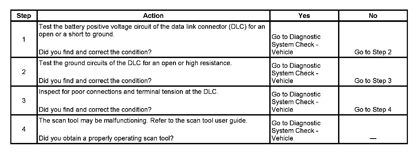 4. If the battery positive voltage and ground circuits of the DLC are functioning properly. The malfunction must be due to the scan tool.