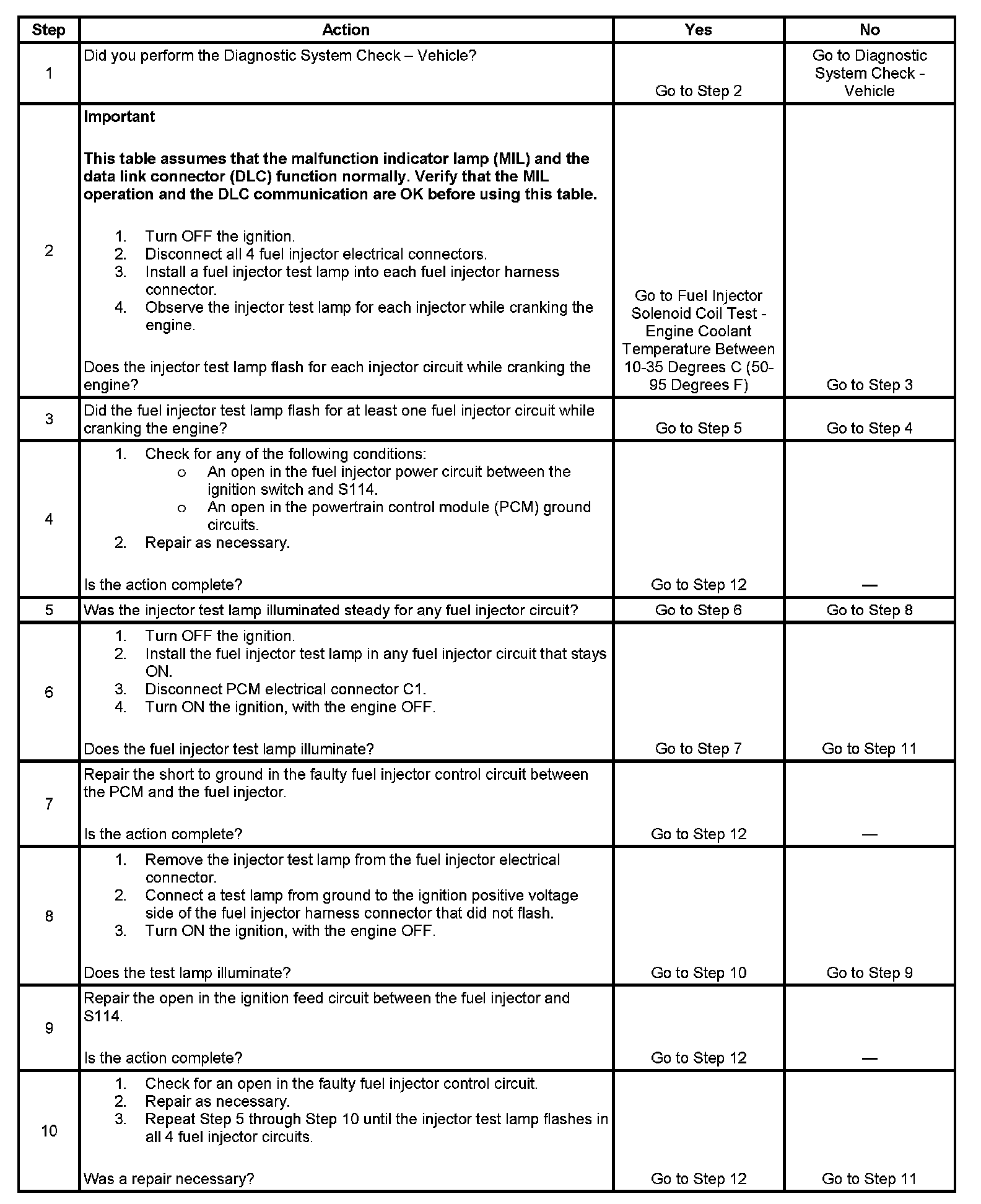 3. This step checks for a fault that affects all the fuel injectors.