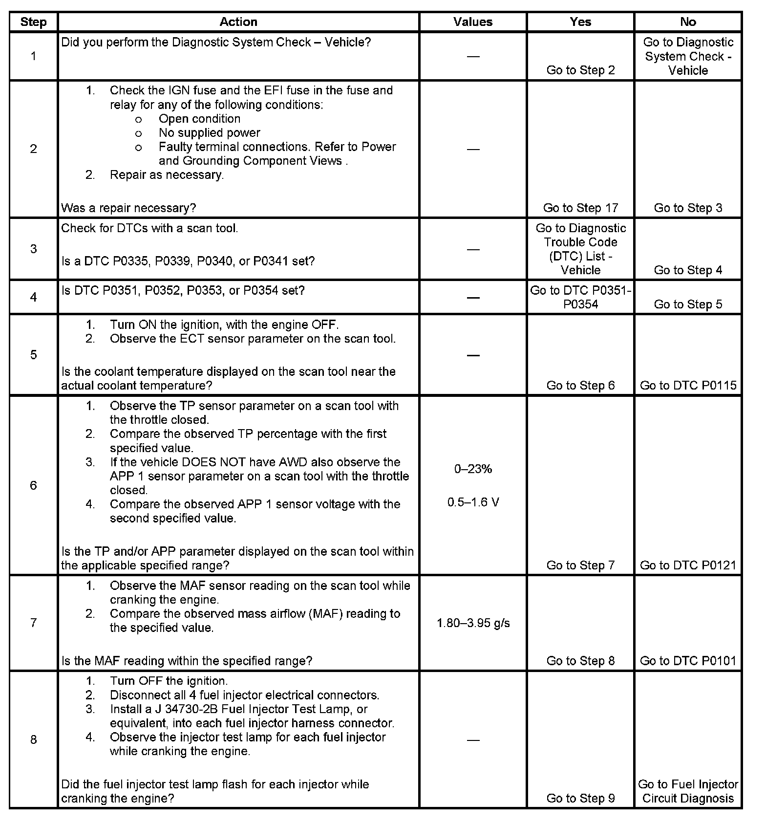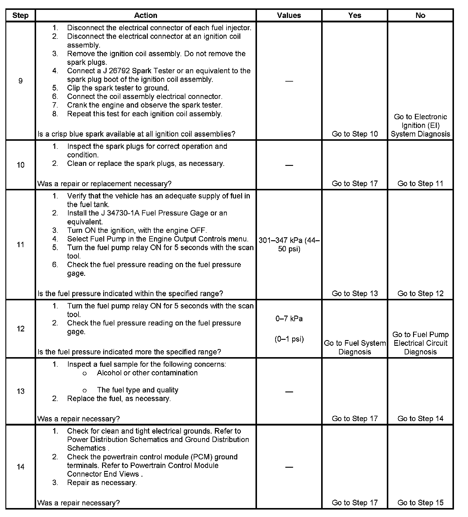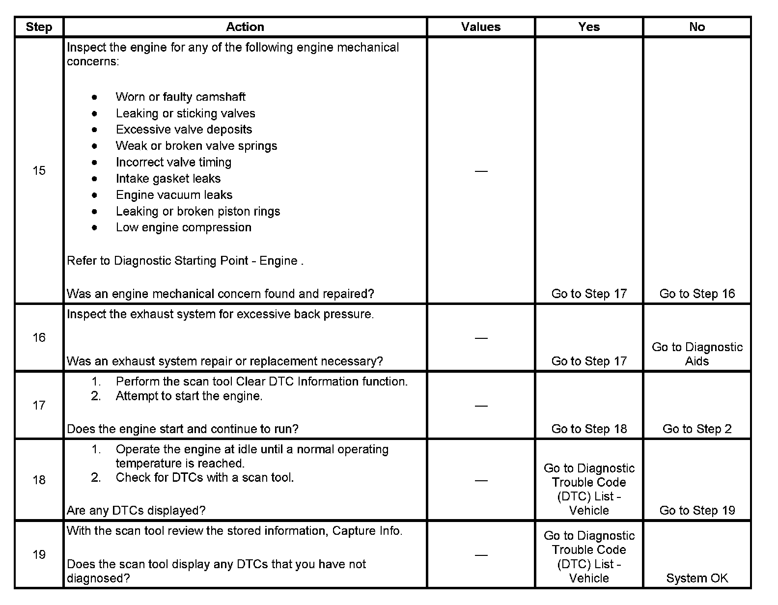 17. This step checks to see if the engine will start and run. The repair that may have led to this step may only have been a secondary cause of the no start condition, such as fouled spark plugs. The diagnostics in this table may need to be performed a second time in order to discover the root cause of the no start condition.