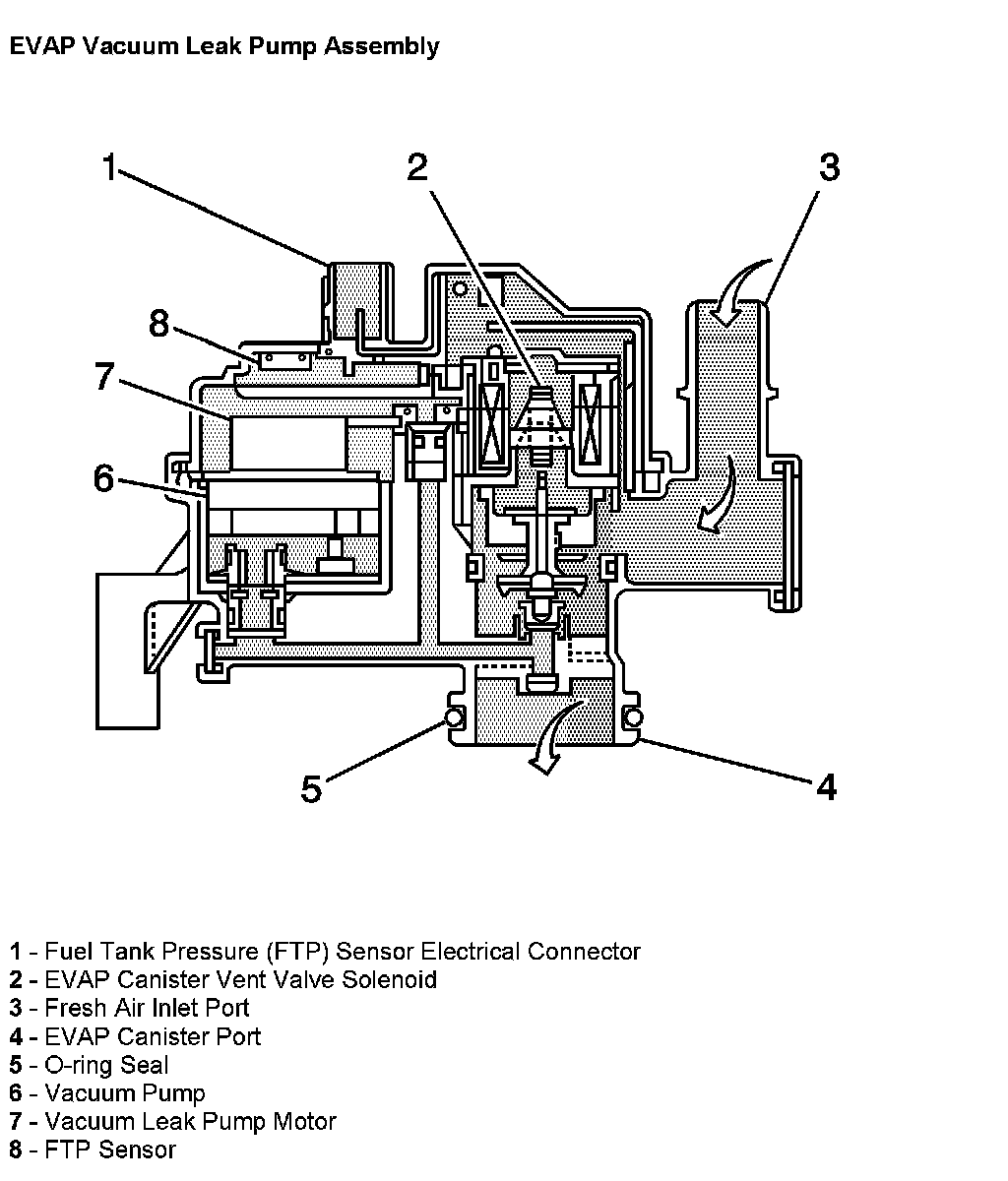 The EVAP vacuum leak pump assembly contains the fuel tank pressure (FTP) sensor, the canister vent solenoid, and an electric motor driven vacuum pump. The vacuum pump provides pressure for leak testing when the engine has been OFF for at least five hours and the engine coolant temperature (ECT) is less than 35 °C (95 °F). If the ECT is greater than 35 °C (95 °F) after five hours, the diagnostic will wait an additional two hours. If the ECT is still greater than 35 °C (95 °F) after seven hours, the diagnostic will wait an additional two and a half hours. The pump assembly also has several internal filters and a 0.5 mm (0.020 inch) reference orifice. The reference orifice provides controlled movement of the pressure within the system, enabling the FTP sensor to accurately monitor system performance. The complete pump assembly is mounted on the EVAP canister, eliminating the need for additional hoses or lines for connections.