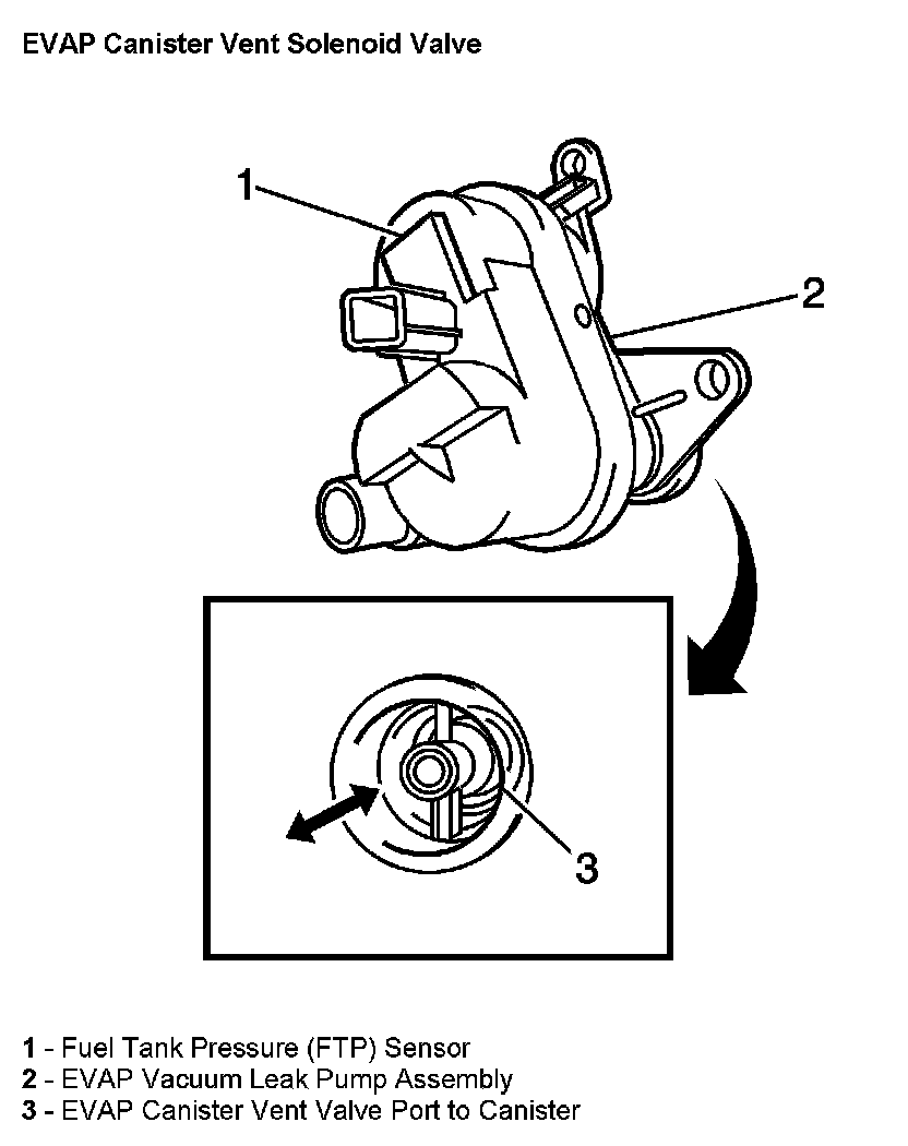 The EVAP canister vent valve is an integral part of the EVAP vacuum leak pump assembly (2). The vent valve controls the flow of clean air into or out of (3) the EVAP canister. The vent valve is normally open. Under certain conditions the PCM commands the vent valve closed in order to seal the EVAP system for leak diagnosis.