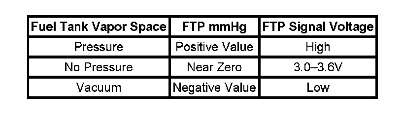The fuel tank pressure (FTP) sensor, measures the difference between the fuel tank and outside air pressure. The FTP sensor is an integral part of the EVAP vacuum leak pump assembly. The PCM provides a 5-volt reference and a ground to the FTP sensor. The FTP sensor provides a signal voltage back to the PCM that can vary between 0.1 and 4.9 volts. As the fuel tank pressure increases, the FTP sensor voltage decreases, as the fuel tank pressure decreases the FTP sensor voltage increases. High pressure = high voltage. Low pressure vacuum = low voltage.