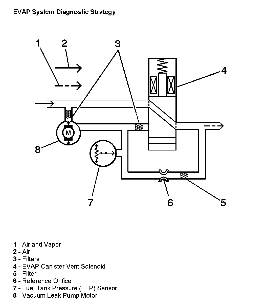 During normal EVAP system operation the EVAP canister vent valve (4) is OPEN allowing the flow of fresh air (2) into the EVAP canister. If the EVAP canister purge valve is also OPEN, the fresh air will mix with vapors stored in the canister and flow (1) from the canister to the intake manifold. The FTP sensor (7) is used to monitor system operation and the vacuum leak pump (8) provides vacuum pressure for leak detection.