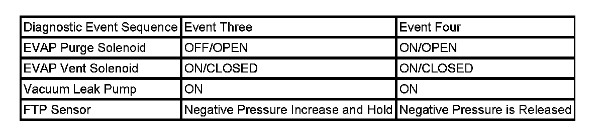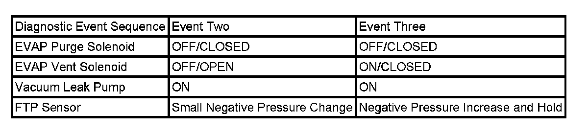 Event three tests for a large leak in the EVAP system. The PCM commands the EVAP vent valve ON, CLOSED, sealing the EVAP system. This allows the vacuum pump to create a large increase in negative pressure. If the expected increase in negative pressure is not achieved, a large leak is indicated and a DTC P0455 can set. If there is no change in pressure when the vent solenoid is turned ON, the vent solenoid may be inoperative and a DTC P2420 can set.