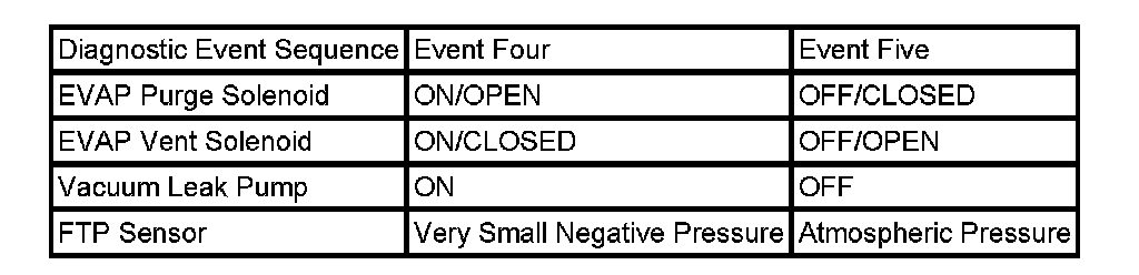 In event five all of the EVAP components return to the same state they were in event one. Because the vacuum pump remained ON in event four, the FTP sensor still detected a small vacuum. Now, with all components OFF, the pressure should return to atmosphere, indicating there are is no blockage or restrictions in the EVAP system.