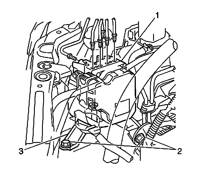 3. Install the 2 bolts (2) to the brake pressure modulator bracket (3).