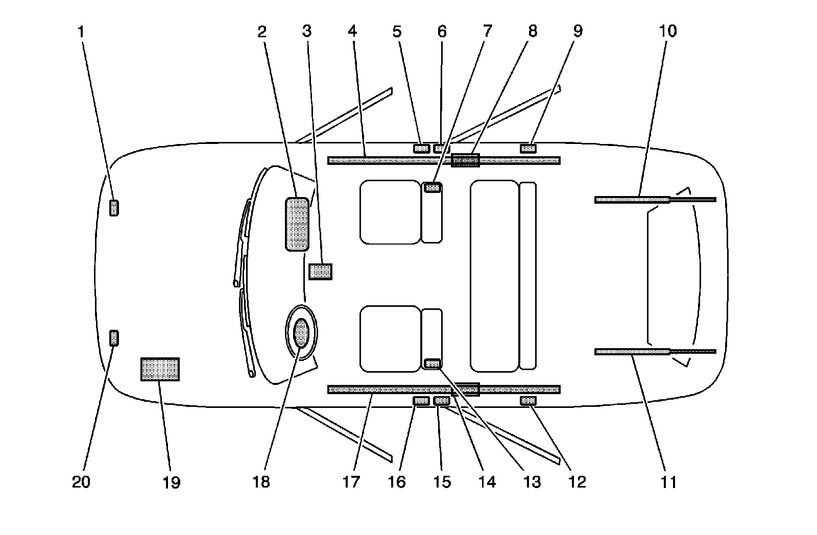 17 - Right Roof Rail Air Bag-Located under the headliner. extending from the passenger front windshield pillar to the passenger rear windshield pillar