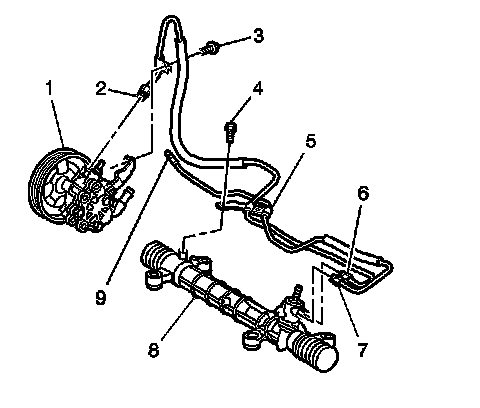 3. Loosen the clamp that retains the power steering cooling pipe to the end of the power steering gear outlet hose (9).