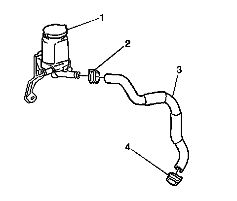 2. Loosen the hose clamp (4) that retains the reservoir outlet hose to the power steering pump.