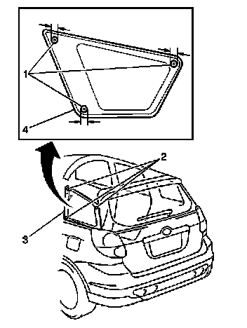 4. Gently unseat the quarter window retainer-male ends (1) on the window (4) from the quarter window retainer-female ends (2) on the body.