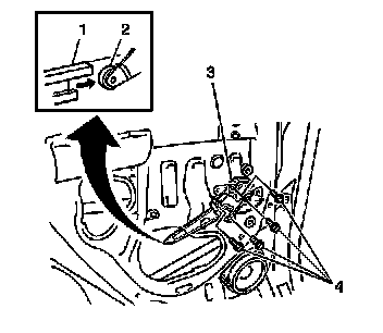 Slide the regulator arm roller (2) into the window bottom channel (1). Secure the regulator with the 4 bolts (4).