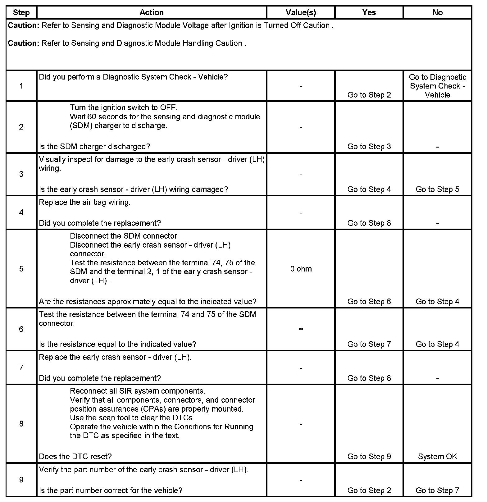 Upon passing these tests, the ignition and deployment loop voltages are measured to ensure that these voltages are within the normal ranges. The SDM monitors the voltages at the driver low and the passenger low to detect shorts to ground or voltage in the deployment loops.