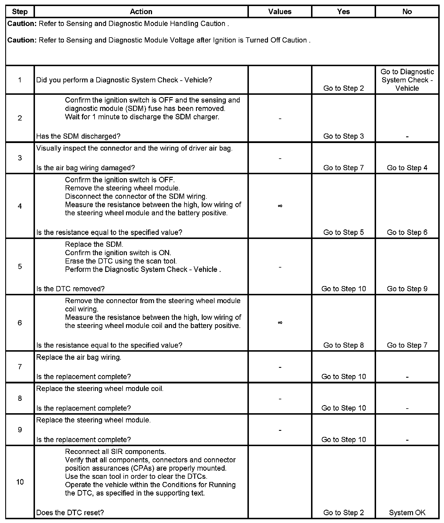 Upon passing these tests, ignition and deployment loop voltages are measured to ensure that they are within their normal voltage ranges. The SDM monitors the voltages at the driver low and the passenger low to detect shorts to ground or voltage in the deployment loops.